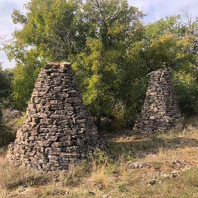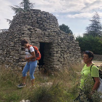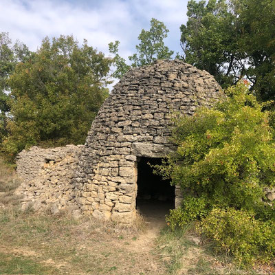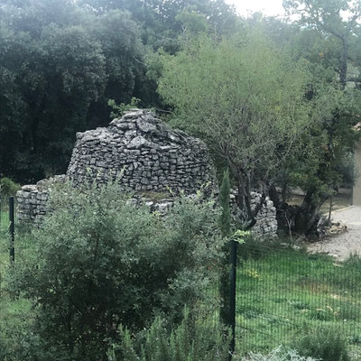 Toujours vers le Sud, avec une belle vue sur le Luberon, nous avons emprunté un petit sentier à travers d’anciens champs (céréales, vigne, oliviers, amandiers, lavande), qui nous a conduit vers un très joli cabanon en gradins évoquant « une ziggourat de Mésopotamie ».
