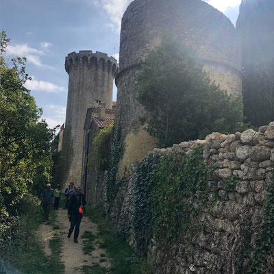 Nous avons ensuite rejoint l’église Saint-Hilaire, un peu en contrebas du village médiéval, sa porte Sarrazine, ses petites places, avons dépassé son ancien moulin à huile puis avons traversé la cour du château pour rejoindre notre point de départ.